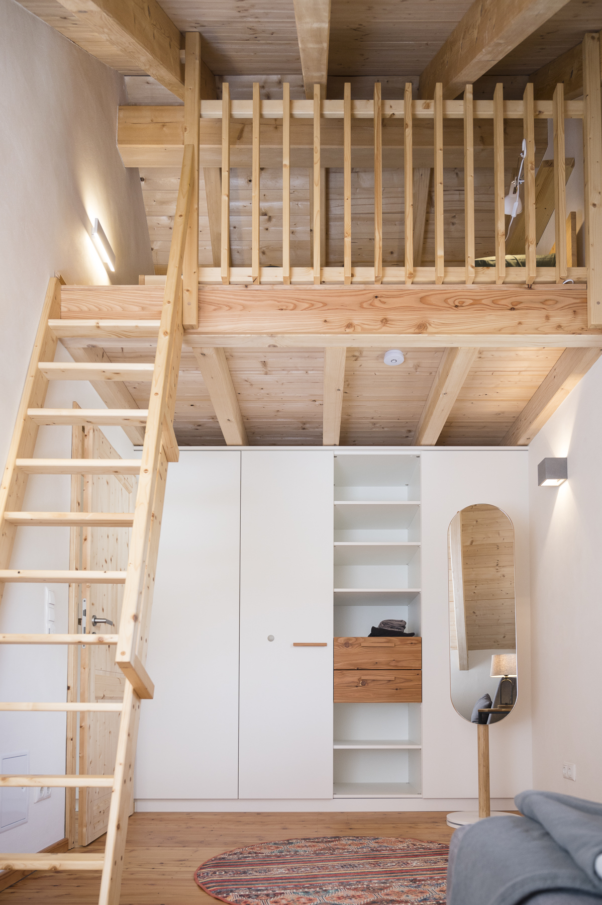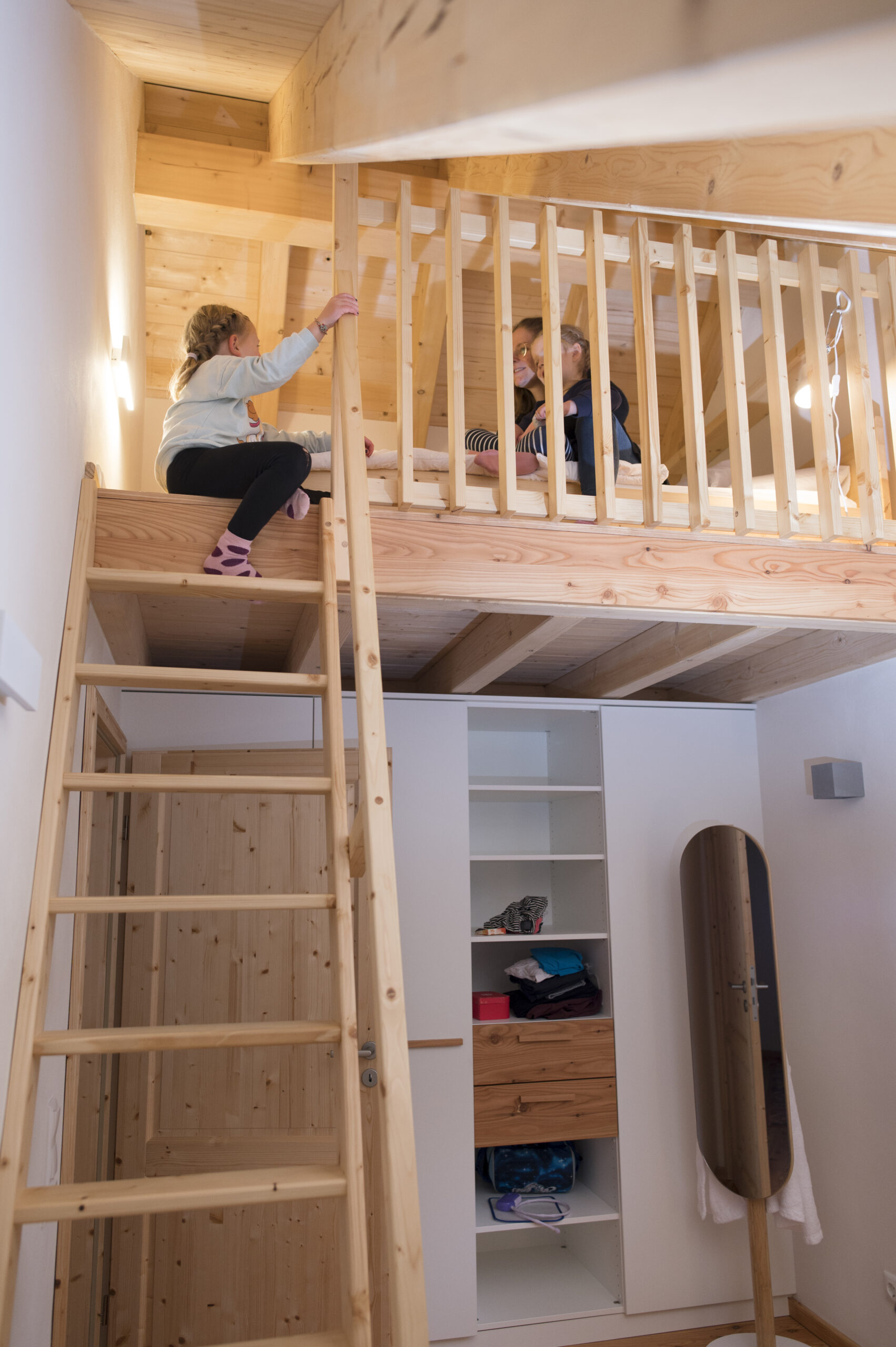 - Kleines Schlafzimmer mit Schlafpodest (1,40 × 2,00 m, über Leiter erreichbar)